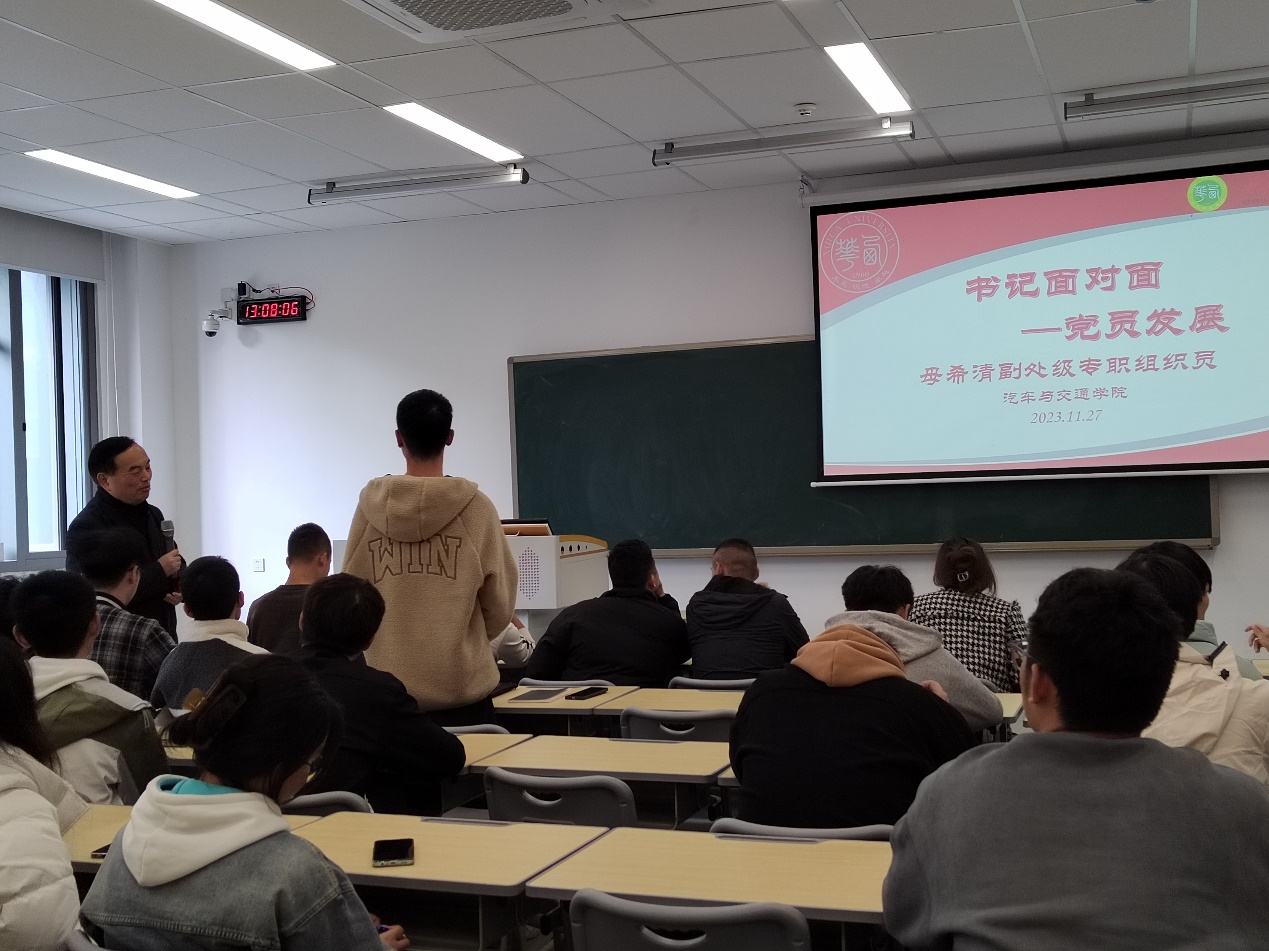 积极向党组织靠拢乃是当代青年共同的理想,在交流会报名之初,同学们皆热切期待,急切想要了解更多关于党员发展的相关信息。因此,我院副处级专职组织员母希清在此次交流会上对热衷向党靠拢的同学们表示由衷的赞赏和鼓励!包括书面材料的准备、入党流程及分阶段细节,到入党积极分子的推优与考核,最终至正式党员的培养要求等,母希清都作了全面而详尽的介绍。之后,他仔细询问了在座同学的入党情况,并对入党转正过程中遇到疑虑和困扰的同学给予了详细的解答并提供解决方案。最后,在面对面交流环节结束之前,母希清向大一新生及其即将转正的同学表达了真诚的祝福与勉励。