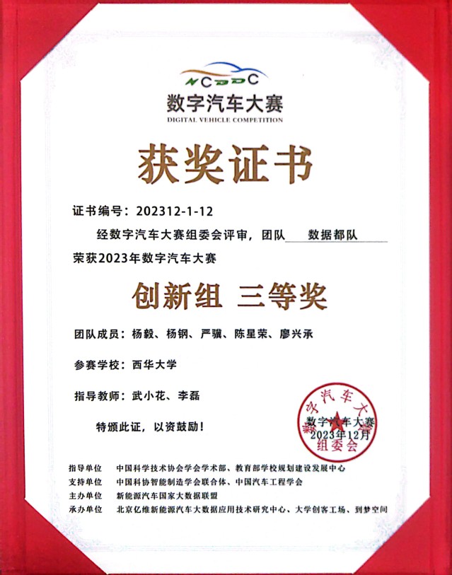 2023年12月23-24日,第六届数字汽车大赛全国总决赛在广东省佛山市南海区千灯湖创投小镇圆满落幕,bevictor伟德在该项赛事首次进入决赛并斩获佳绩。在武小花、李磊老师的精心指导下,bevictor伟德学生团队杨毅、杨钢、严骥、陈星荣、廖兴承晋级总决赛,团队参赛作品《基于充电数据的电池健康状态及剩余使用寿命预测》获得“数字汽车大赛创新组三等奖”。