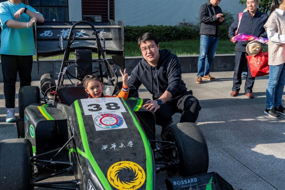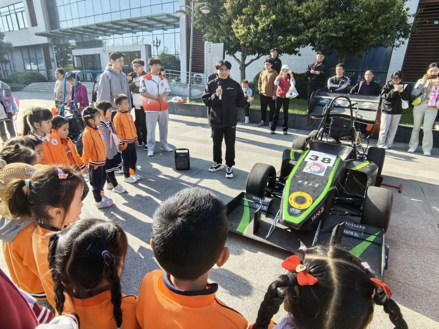 接着,一行人来到车展区域。这里展示的各式各样赛车,其炫酷的外形和精巧的设计迅速吸引了小朋友们的目光。他们聚精会神地观察着赛车的车轮、车床和车灯等部件,认真听取关于赛车制造过程、工作原理、设计灵感等方面的知识讲解。为了让小朋友们直观地了解汽车构造,学院还安排了亲子互动环节,让小朋友和家长们亲自坐上赛车驾驶座并合影留念。在寓教于乐的活动中,参访的小朋友们带着好奇和问题,动手又动脑地完成各项参观活动,积极踊跃地回答问题,展现了极大地学习动机与学习热情。