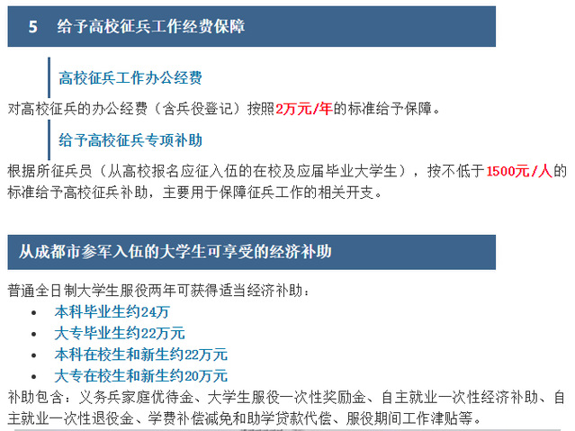 近日,成都市修订了《关于进一步鼓励大学生参军入伍的意见》,全面升级大学生参军入伍鼓励政策: