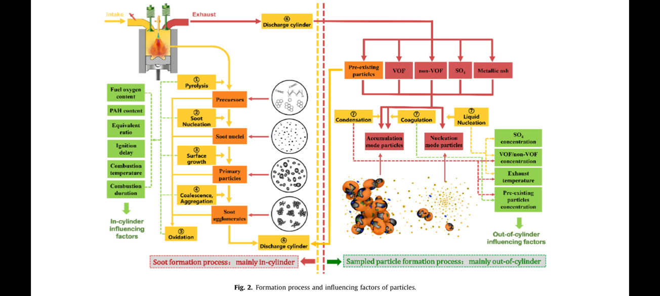 从颗粒形成的过程出发,探究了不同因素对颗粒排放的影响,提出了一种RCCI发动机尾气中颗粒排放的影响机理。柴油机颗粒的形成应分为缸内和缸外两个过程。缸内颗粒的六个形成过程主要受到燃料-空气混合特性,包括燃料氧含量、PAH含量和当量比,以及燃烧特性,包括滞燃期、缸内温度峰值和燃烧持续期等因素的影响;而缸外颗粒的形成主要受到包括硫酸及硫酸盐浓度、挥发性和非挥发性有机物浓度、排气温度和预存颗粒浓度等因素的影响。研究中还发现了滞燃期对RCCI发动机中的颗粒排放没有决定性的影响,同时还发现缸内过程的缸内温度峰值,缸外过程的排气温度和有机物浓度对颗粒具有强烈的影响作用。论文链接: