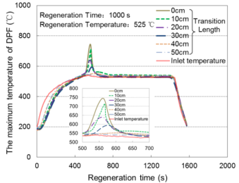 搭建了再生性能测试台架:测试了不同长度过渡段对DPF再生时载体最高温度的影响关系,获得了颗粒在DPF内均匀沉积再生时的临界再生时间。实验台架和研究结果如图1-3所示。
