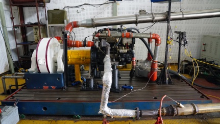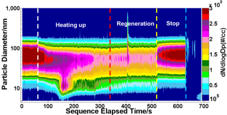 搭建了柴油机后处理测试台架:采用缸内后喷的方式,进行DPF主动再生,开展了DPF出口颗粒排放特性研究。实验台架和研究结果如图4-6所示。