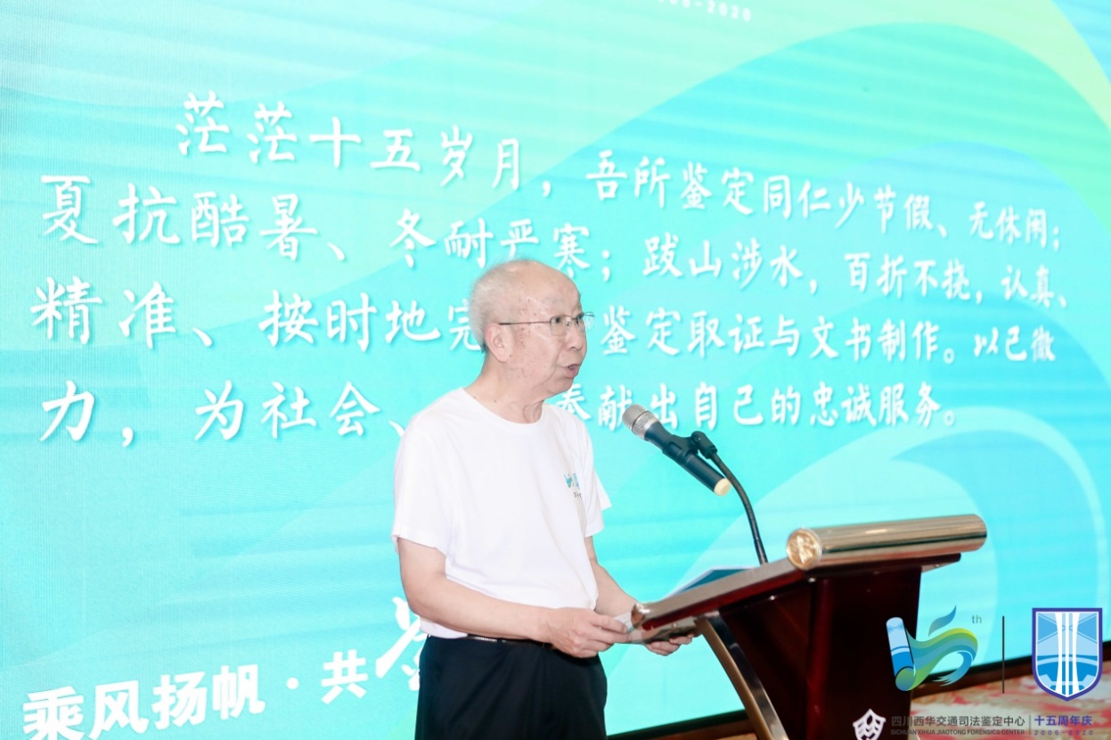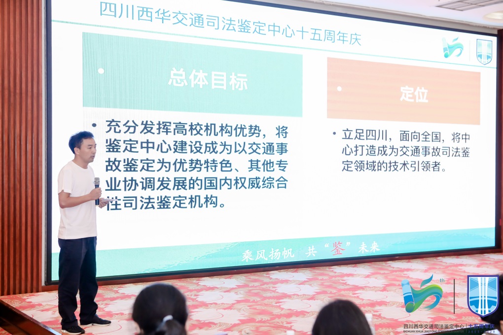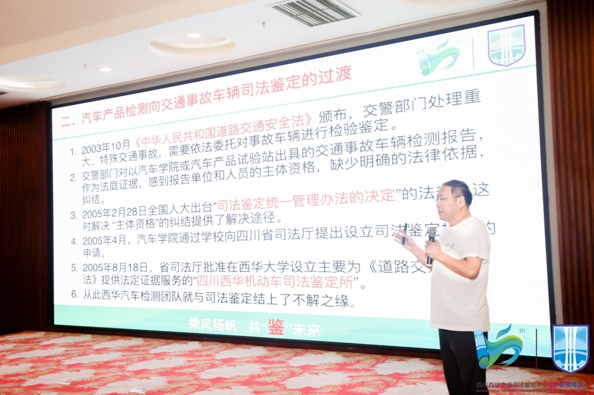 大屏幕播放视频展示了中心15年的发展历程、取得的成绩。随后,中心主任黄海波教授作了题为《汽车检测向司法鉴定转变的回顾》的汇报发言,回顾了鉴定中心成立的内外动因,回顾了中心从十余人发展到今天八十余人,从单一的机动车司法鉴定项目发展到今天具备“物证、声像、法医”三大类八领域司法鉴定项目资质的综合性鉴定机构的发展历程。取得这些成绩离不开学校及汽车学院的支持,离不开校内相关学科多年的学术/技术积累和各专业领域鉴定人的开拓创新!2005年,西华司鉴以机动车鉴定“乘风扬帆”;现在,西华司鉴以多领域鉴定“共鉴未来”!