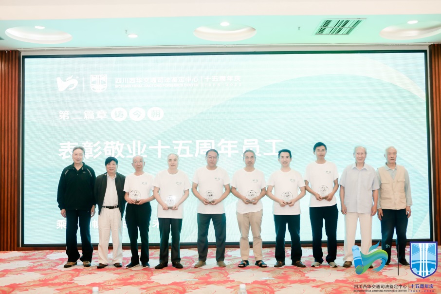 庆典进入第二个篇章“铸今朝”。首先,分别表彰了在中心工作15年和工作10年的员工群体,分别给他们颁发了“敬业15周年”及“敬业10周年”纪念杯,对他们在鉴定中心的创业中辛勤付出和始终如一的敬业精神进行了肯定。