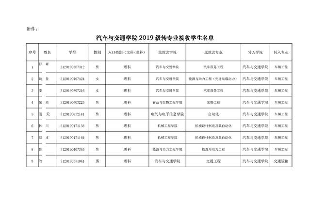 学院2019级转专业接收学生名单公示
