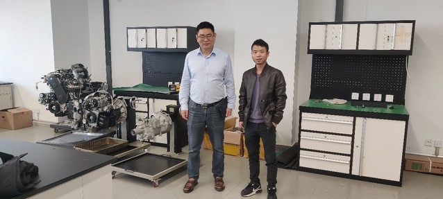 陈红旭(左)参观新能源汽车构造实验室与龙庭美(右)合影