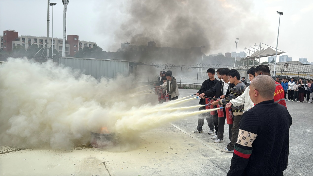 理论讲解完成后,在保卫处工作人员的组织下,我院24级新生每十人为一组,根据先前所学内容使用干粉式灭火器进行灭火实操演练。随着一声令下,同学们一次又一次准确无误地使用灭火器扑灭了火焰,通过实训实操,迅速掌握了这项消防技能。