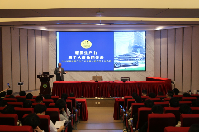 顾国洪以“新质生产力与个人成长的关系(以中国新能源汽车实践与研究的十年为例)”为题,结合自身十余年深耕新能源汽车领域的经验,系统解析了产业变革趋势与人才需求转向。通过详实案例,就技术迭代加速背景下的学习策略优化、职业发展规划等议题,为在座学子提供了兼具前瞻性与实操性的建议,助力青年人才锚定发展坐标。