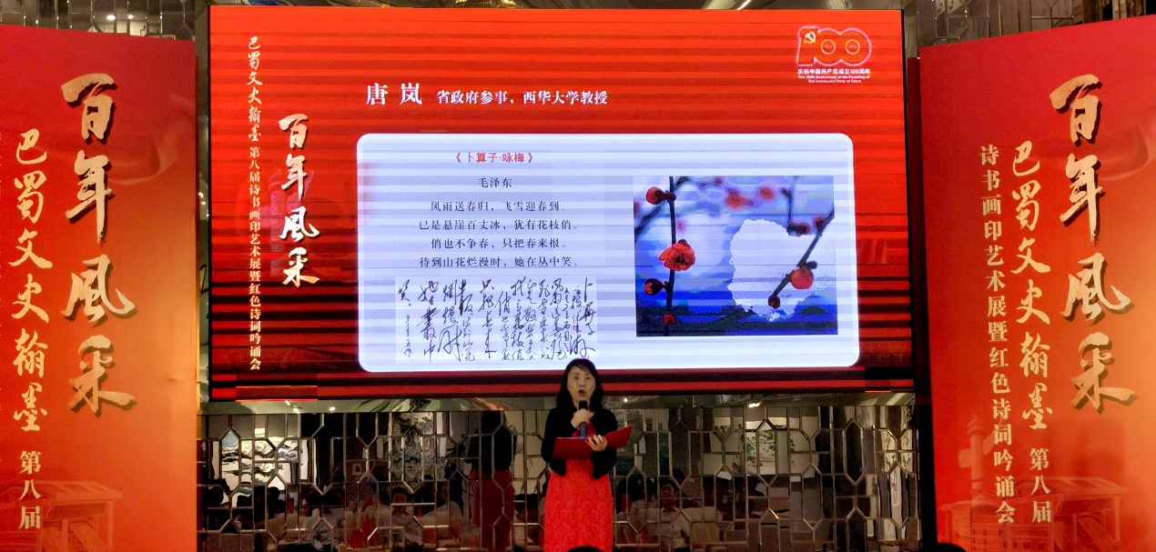本届艺术展以“百年风采”为主题,共展出110件书法、绘画、篆刻作品。6月19日上午10时,艺术展上还举办了红色诗词吟诵活动,由著名节目主持人寒露主持并分享红色诗词作品,参事、馆员、机关干部等将通过诗词吟诵等方式庆祝党的百年华诞,热情讴歌党领导人民百年来取得的伟大成就。我校唐岚教授作为四川省政府参事参加了活动,并在红色诗词分享中,吟诵了毛主席诗词《卜算子·咏梅》。唐岚老师满怀对党、对人民的深厚感情,用诗词传颂了我们党生生不息的红色精神,表达了对党和祖国的赞美之情。