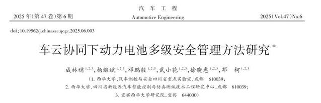 发表于《汽车工程》的论文(第一作者:2022 级硕士成林穗,通讯作者:杨继斌副教授),创新性提出车云协同下的动力电池多级安全管理方法,通过短时间尺度与长时间尺度结合的预警机制,经实车历史运行数据验证,可在长时间尺度上提前至少 5 天识别电池包中的故障单体,大幅提升了动力电池运行的安全性与可靠性。