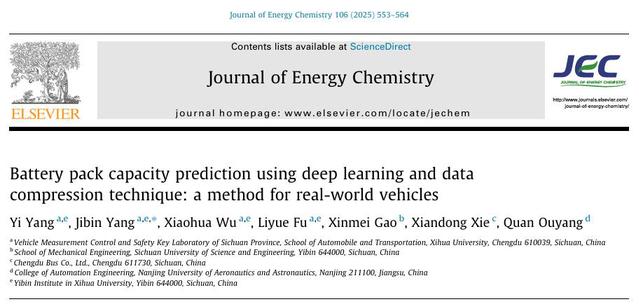 发表于《Journal of Energy Chemistry》的论文(第一作者:2022 级硕士杨毅,通讯作者:杨继斌副教授),提出数据压缩技术与深度学习融合的方法,基于实车运行数据实现了电池组容量的高效预测,为电池状态监测提供了轻量化解决方案。