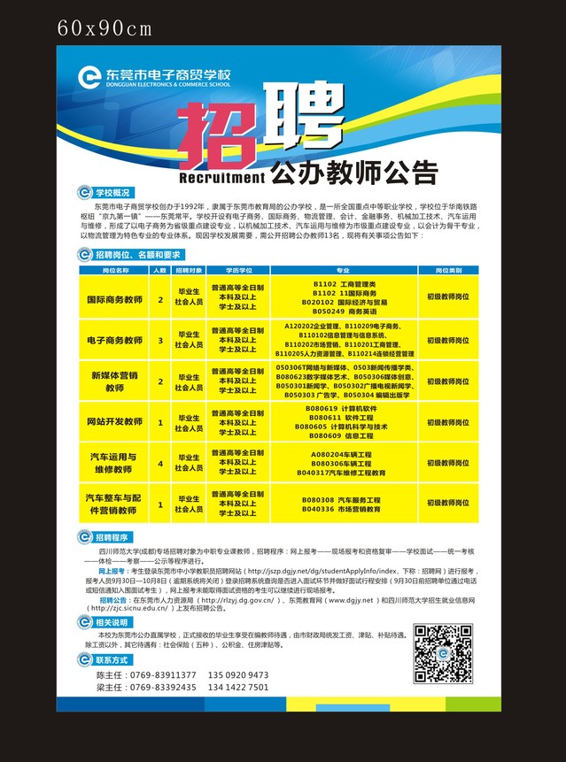 广东省东莞市教育局赴四川师范大学公开招聘2018年公办中职学校专业课教师114名,其中东莞市电子商贸学校招聘13名(见下表)。