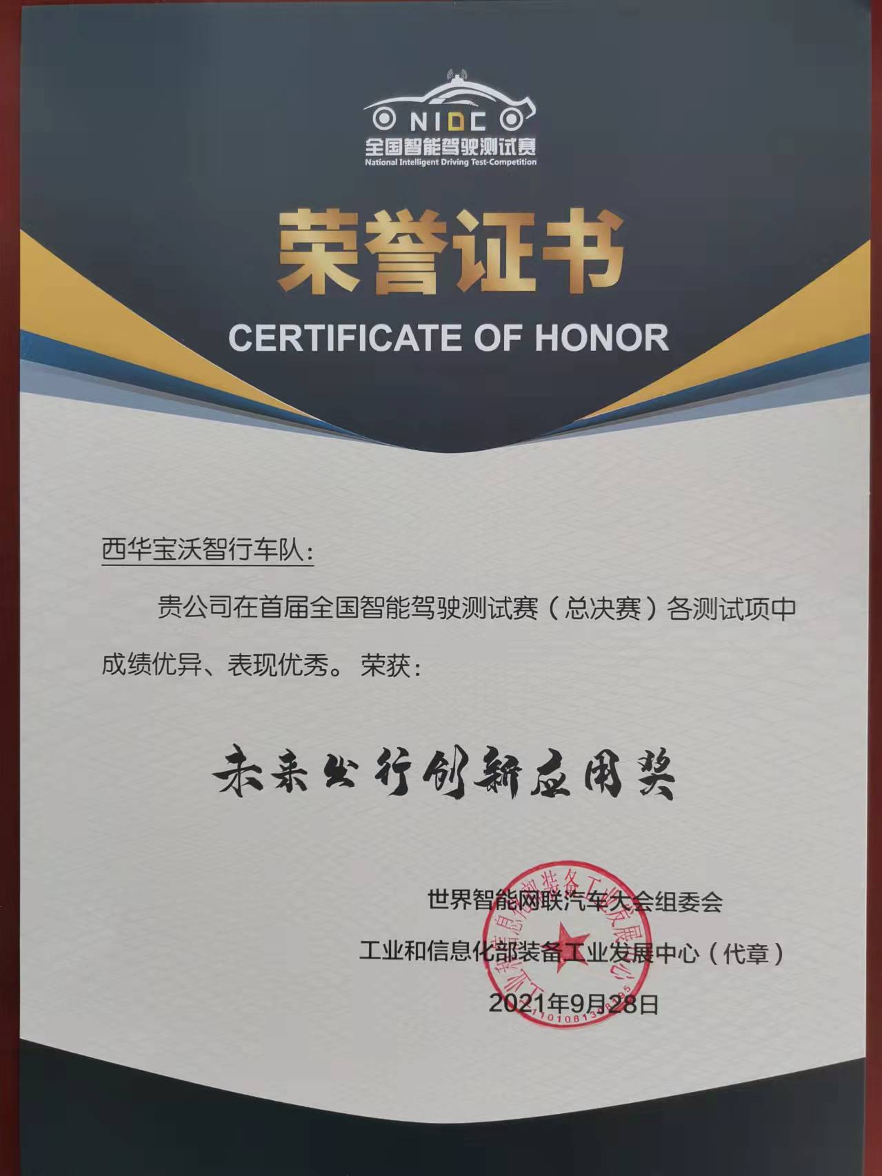 最终西华宝沃智行车队在总决赛各项测试项目表现良好,经过裁判专家组进行评分,西华宝沃智行车队获得未来出行创新应用奖。同时,组委会为鼓励和支持bevictor伟德在智能网联科研创新和人才培养上的贡献,特为bevictor伟德颁发高校科研创新专项奖。