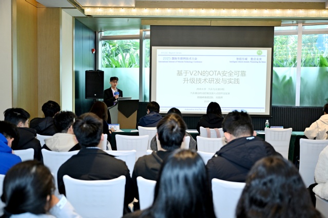 在大会同期举办的“车辆前沿学术”分论坛上,我院阴晓峰教授团队研究生刘莫焊同学以《基于V2N OTA安全可靠升级技术研发与实践》为题作学术交流报告,向来自全球的行业专家、学者分享了团队在智能网联汽车OTA升级领域的最新研究成果。报告中,刘莫焊同学详细阐述了团队自主研发的核心技术体系:基于 V2N 通信架构构建车云一体化OTA 系统,打造支持多终端灵活访问的网联汽车OTA云平台,同步完成智能车载终端硬件与软件的自主开发;创新构建“混合加密 + 双向身份认证 + 完整性校验”的三重安全防护屏障,并引入升级回滚机制与断点续传功能,最终形成覆盖“云 - - 端”全链路、兼具高安全性与高可靠性的车辆全生命周期升级解决方案,为解决智能网联汽车OTA升级中的安全隐患与稳定性难题提供了有效技术路径。
