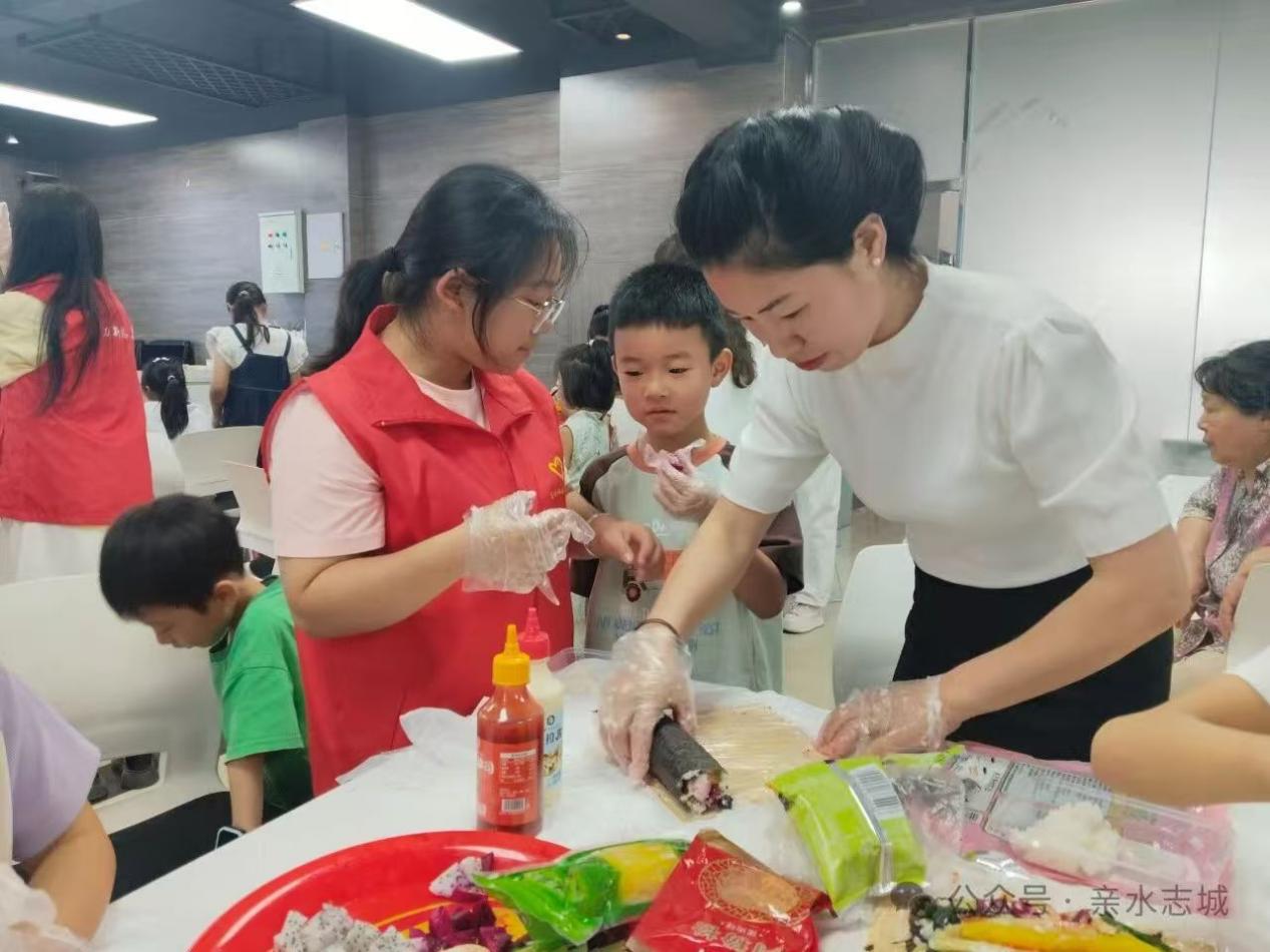 "手作水果寿司—萌娃食神争霸赛"将厨房变身创意工坊。志愿者们首先讲解食材营养知识,随后指导孩子们用紫菜、米饭、芒果、草莓等食材制作创意寿司。孩子们发挥想象,将寿司卷成花朵、小动物形状,甚至用海苔剪出表情贴纸装饰。最终,通过趣味投票评选出"最佳造型奖""最萌吃货奖"等多个奖项。社区居民王女士感慨:"这样的活动既锻炼了孩子的动手能力,又让他们学会珍惜食物,比单纯玩手机有意义多了。"