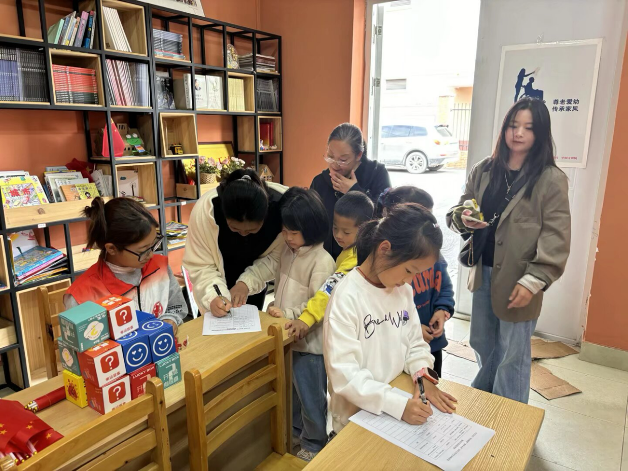 活动筹备阶段,四个团支部的志愿者们便分工协作:有的提前到场地丈量尺寸、布置国风主题背景板,有的分类整理国庆盲盒、空白团扇、彩笔、国潮贴纸等物料,还有的梳理国庆趣味小知识,为破冰环节做足准备。活动开场后,志愿者们引导亲子家庭签到及领取盲盒来开启破冰环节,使大家快速熟络