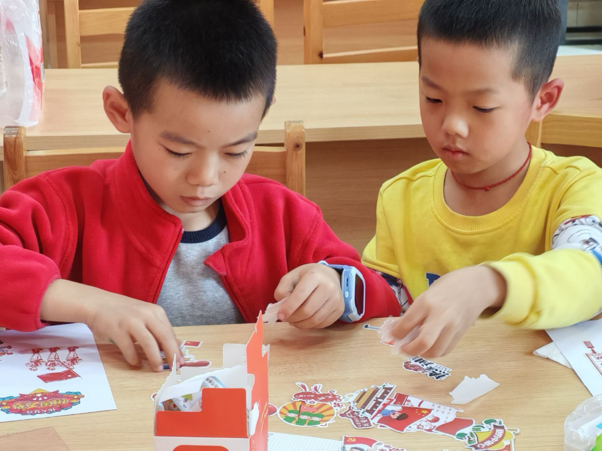 进入核心创作环节,孩子们在志愿者的引导下,分为“团扇绘中国”和“国潮拼贴画”两个小组展开创作。他们手握彩笔,在团扇上精心勾勒国旗、天安门、灯笼等元素,或是挑选祥云、京剧脸谱、中国结等国潮贴纸,拼贴出独具童趣的创意画作。志愿者们耐心陪伴在旁,帮低龄孩子固定贴纸、提醒色彩搭配技巧,让整个创作过程温馨又有序。