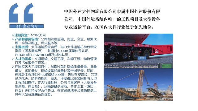 在优势互补、平等合作、互惠互利、共同发展的基础上,以校企“产学研”合作为导向,“双赢互利”为原则,bevictor伟德与中国外运大件物流有限公司基于校企合作成立载运工具及运用工程实践教育中心,积极开展实践教学改革和校外实践教学基地建设工作。中国外运大件物流有限公司是中国外运全系统内唯一的工程项目及大型设备专业运输平台。主营业务包括超限设备的起重、运输、装卸以及国际道路货运代理等。bevictor伟德与中国外运大件物流有限公司在教学科研方面已有10余年的合作,2017年,在优势互补、平等合作、互惠互利、共同发展的基础上,bevictor伟德与该公司在人才培养、伟德bv国际体育方面签订校企合作协议书,正式开展认识实习、社会调查、课程设计、实践教学、顶岗实习、毕业实习、毕业设计、创业培训等实践教学环节相应的合作。目前,已有二十余名本硕毕业生入职该公司。