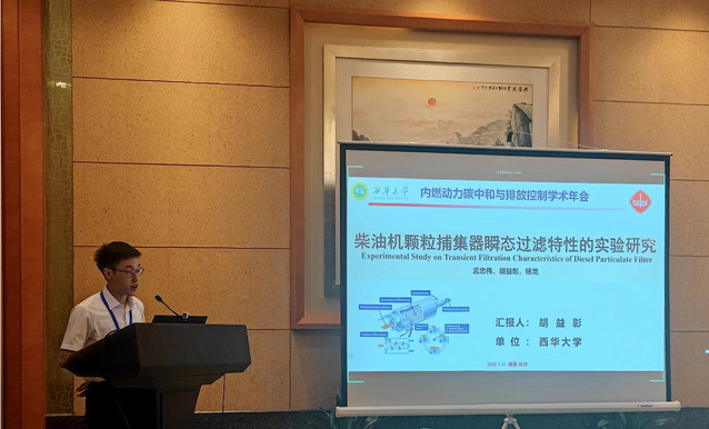 孟忠伟教授团队三名研究生胡益彰、曾渤淞、邓盟也分别进行了论文宣读,并与在场专家、同学们进行了相关研究内容的讨论,其中作者为孟忠伟、胡益彰、杨龙的论文“柴油机颗粒捕集器瞬态过滤特性的实验研究”在会后被遴选为本次大会的优秀论文,该论文研究了柴油机颗粒捕集器在发动机瞬态工况下的工作特性,其创新性引起了相关学者的广泛兴趣。