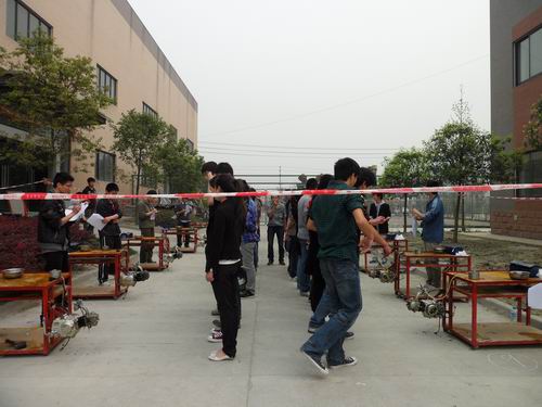 两个小时后,选手按抽签决定的序号依次进入赛场。经过了专业的培训,他们个个都摩拳擦掌,迫不及待地想自己动手实践。随着总裁判一声令下,参赛选手们展开了激烈的角逐,各队队员分工合作,将自己的理论知识融入实际操作中,充分利用刚学到的拆装技巧,通过相互巧妙的配合,以最快的速度向发动机“进攻”。就连平时娇弱的女生此时在笨重的发动机前也显示出别样的风姿。因为绝大多数选手是第一次拆装发动机,所以比赛过程并非一帆风顺,但团队的力量使得大家拧成一股绳,最终顺利的完成了比赛任务。