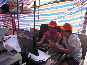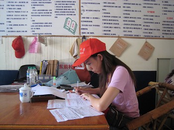 面对比抗震救灾任务更加艰巨更加繁琐的灾后重建工作,作为当代大学生,作为共产党员,我们责无旁贷。待队伍简单安顿好住宿后,志愿者们迫不及待想要投入工作当中,一行16人驱车奔赴彭州市丹景山镇,志愿者们应政府的需要分配到白塔村、五柏村、东河村、东前村、关口社区等村委会协助录入灾区救灾物资分发明细表、房屋损毁情况统计表等各种信息。一向被认为是时代娇子的大学生们在执行任务的过程中,充分展示了不怕累、吃苦耐劳的精神,面对厚厚的账本,我们的队员顾不上拭去额头上的汗水……