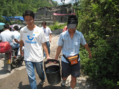 活动的最后一天,我们的志愿者来到了通济镇大坪村。由于天气太热,由我校协助建立的帐篷学校暂时停课。但大家没有休息,直接来到村民家中,为他们做一些我们力所能及的事情,同时询问了他们的居住情况、房屋震前震后的情况、主要经济收入、孩子上学问题、对政府政策的看法以及震后自救的态度等问题。大坪村村民的热情、善良和坚强深深地感动了我们,让大家更加无视酷暑和劳累。