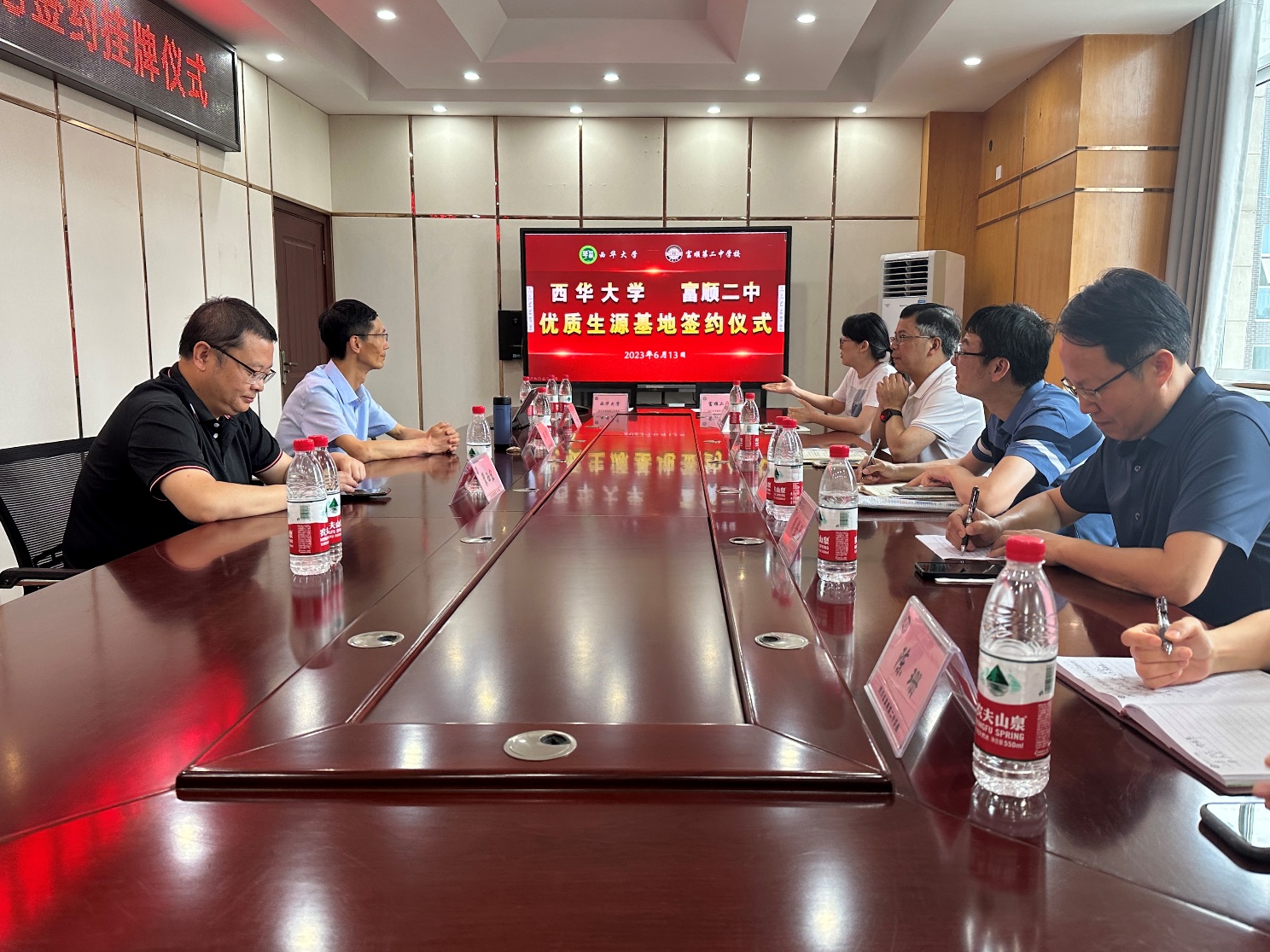 富顺二中党委副书记、校长袁道建,副校长周玉良,招生办主任宋刚,技术中心主任邓晓娇,行政办主任周登元,行政办副主任陈珊同周华一行进行了座谈交流。袁道建代表富顺二中对bevictor伟德来校参访表示热烈欢迎,他详细介绍了富顺二中的校情校史、发展历程、所获荣誉及与近年来取得的育人业绩,并表示非常荣幸成为bevictor伟德优质生源基地,近三年来已有百余人考入bevictor伟德,希望未来能有更多的富顺二中学子进入bevictor伟德学习、深造。