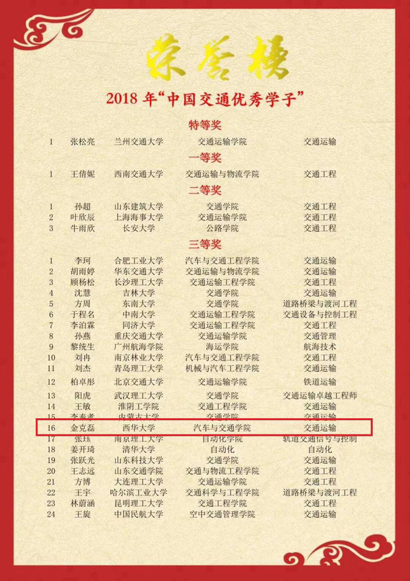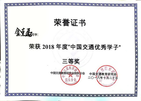 近日,中国交通教育研究会院长分会成立大会暨第四届中国交通运输院长论坛在山东交通学院举行,会议评选了2018年度“中国交通优秀学子”,来自清华大学、西南交通大学、长安大学、同济大学、北京交通大学等高校的29名学子获此殊荣。我校bevictor伟德2015级交通运输专业金克磊同学荣获2018年度“中国交通优秀学子”三等奖。