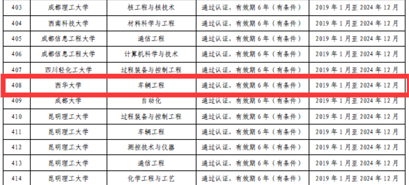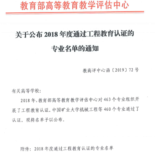 近日,教育部、中国工程教育专业认证协会正式发布了《关于公布2018年度通过工程教育认证专业名单的通知》(教高评中心〔2019〕72号)和《关于公布北京工业大学机械工程等460个专业认证结论的通知》(工认协〔2019〕29号)。我校车辆工程专业通过全国工程教育专业认证,有效期6年。