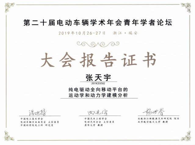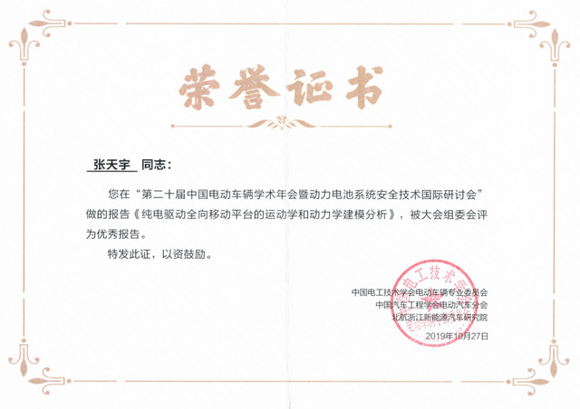 第二十届中国电动车辆学术年会暨动力电池系统安全技术国际研讨会由中国汽车工程学会电动汽车分会、中国电工技术学会电动车辆专业委员会、北京航空航天大学浙江新能源汽车研究院共同主办。为鼓励青年学生积极参与学术交流和行业互动,中国电动车辆学术年会首次设立青年学者论坛,论坛,聚焦智能、网联、新能源汽车技术,吸引了全国包括清华大学,上海交通大学,北京理工大学等10余所知名高校和北汽研究院等科研院所共30余名硕、博士到会作报告。会议评选了9份优秀学术报告并颁发大会优秀学术报告证书。张天宇自信从容,条理清晰,通过理论建立与仿真分析相结合的形式,生动地展示了学习中的成果,获得了评委专家组和参会嘉宾的一致好评,荣获优秀学术报告奖。