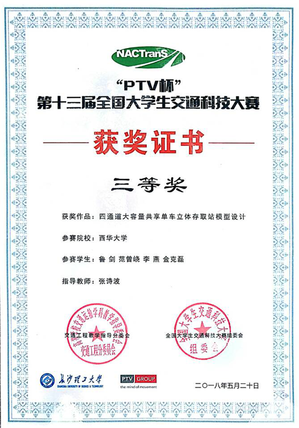 5月19日—20日,“PTV杯”第十三届全国大学生交通科技大赛决赛在长沙理工大学云塘校区举行。经过激烈角逐,我校bevictor伟德2015级交通工程、交通运输专业学生鲁剑、范曾峣、李燕、金克磊在指导教师张诗波的带领下,以作品“四通道大容量共享单车立体存取站模型设计”获得全国三等奖。